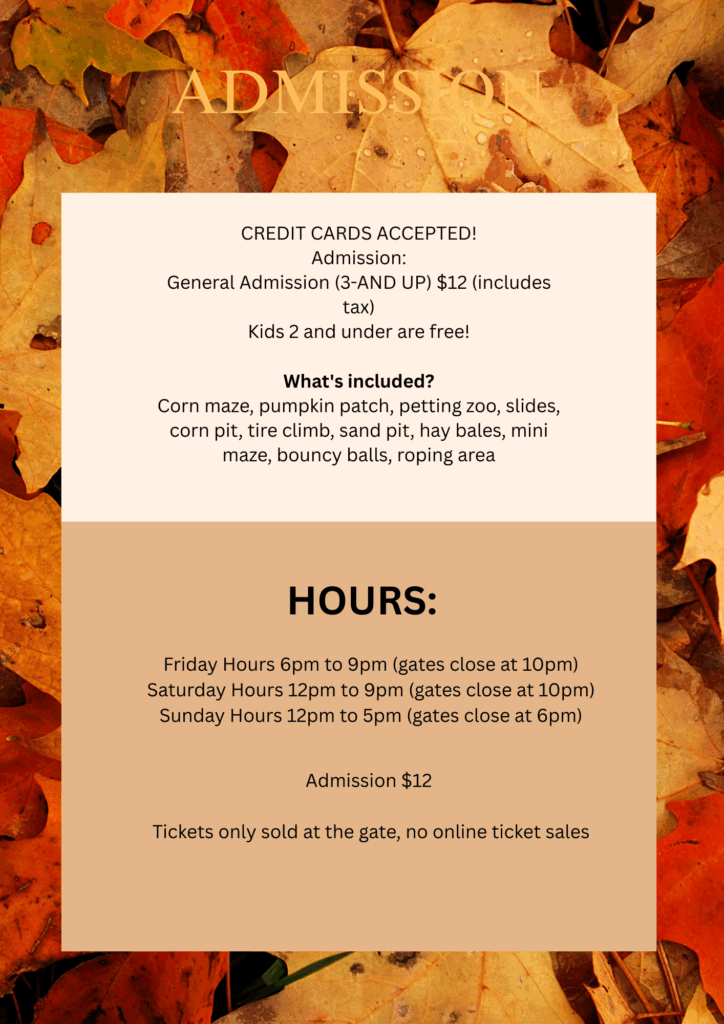 2025 Design is Alice in Wonderland! Admission $12 for ages 3 and up, no online ticket sales, sold at the gate! Admission covers ALL activities. Pumpkins for sale for $10.